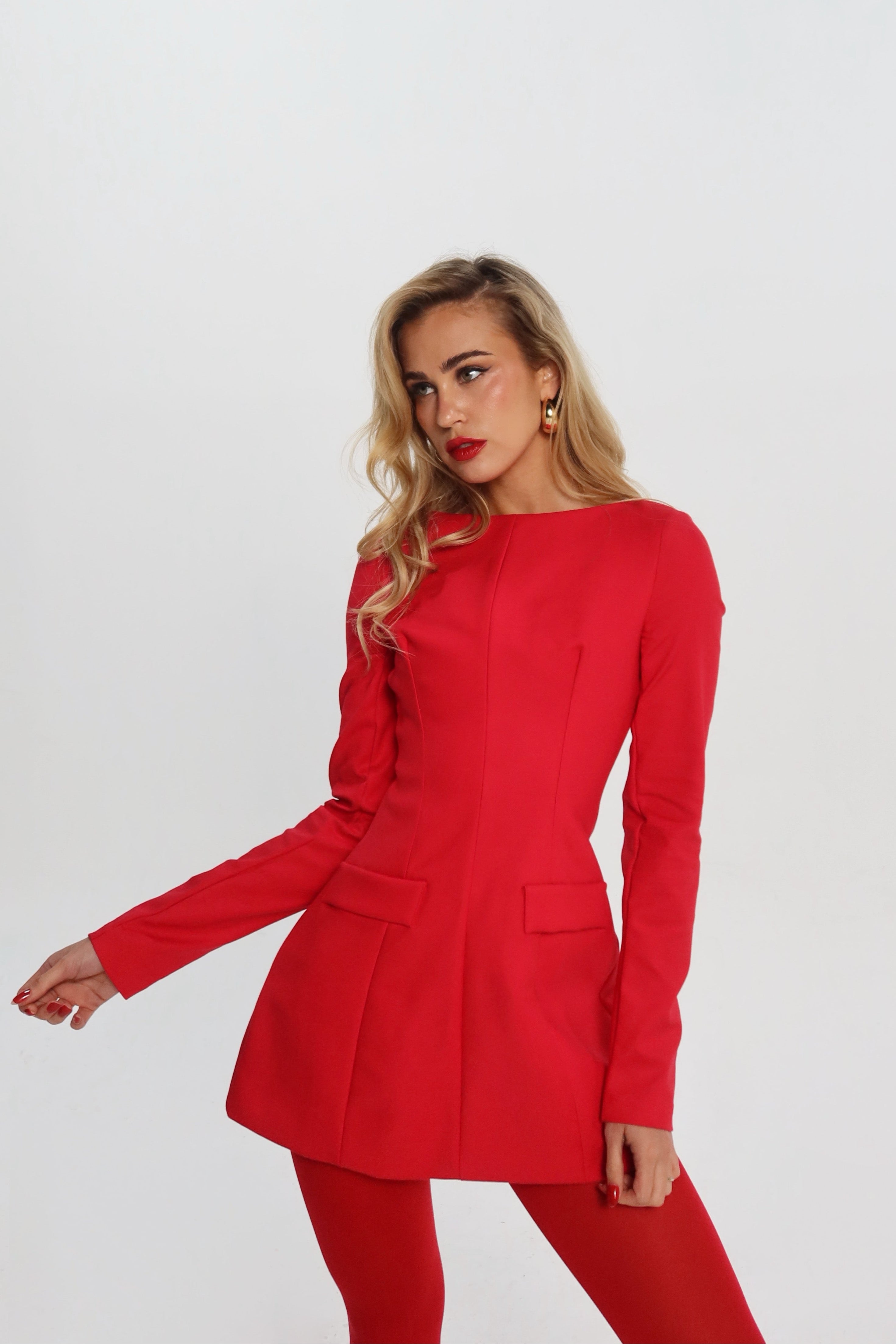 LOOK 1 is a striking structured mini dress designed for confident style. Featuring a bold red hue and long sleeves, this piece combines classic elegance with contemporary edge. The structured silhouette creates a flattering, polished look perfect for evening events, date nights, or making a statement at any occasion. The long sleeves provide versatility across seasons while maintaining a refined aesthetic. An essential addition to any wardrobe seeking timeless sophistication with modern appeal.
