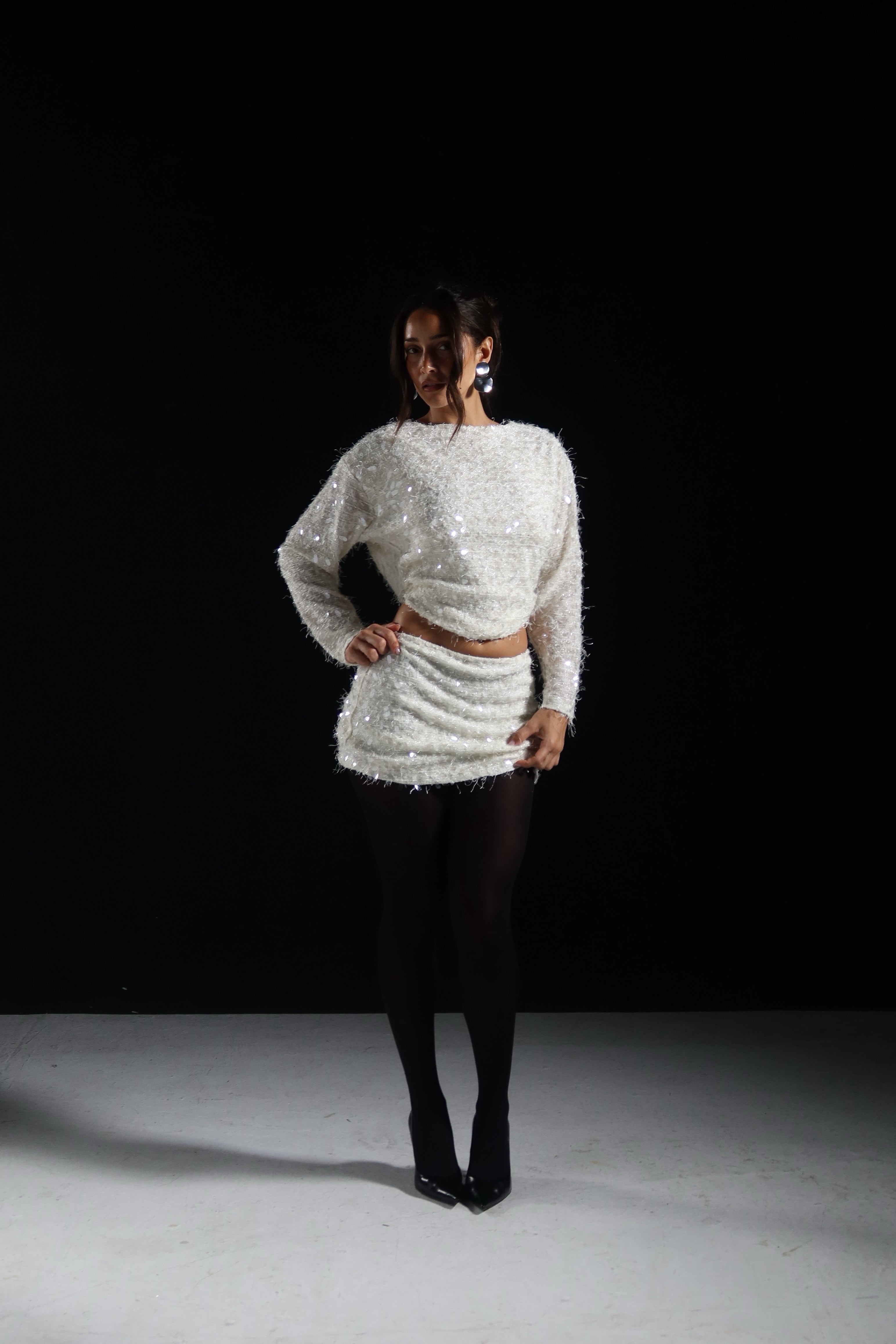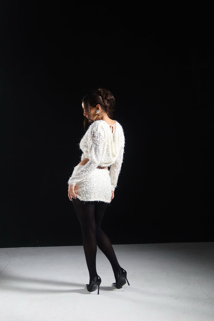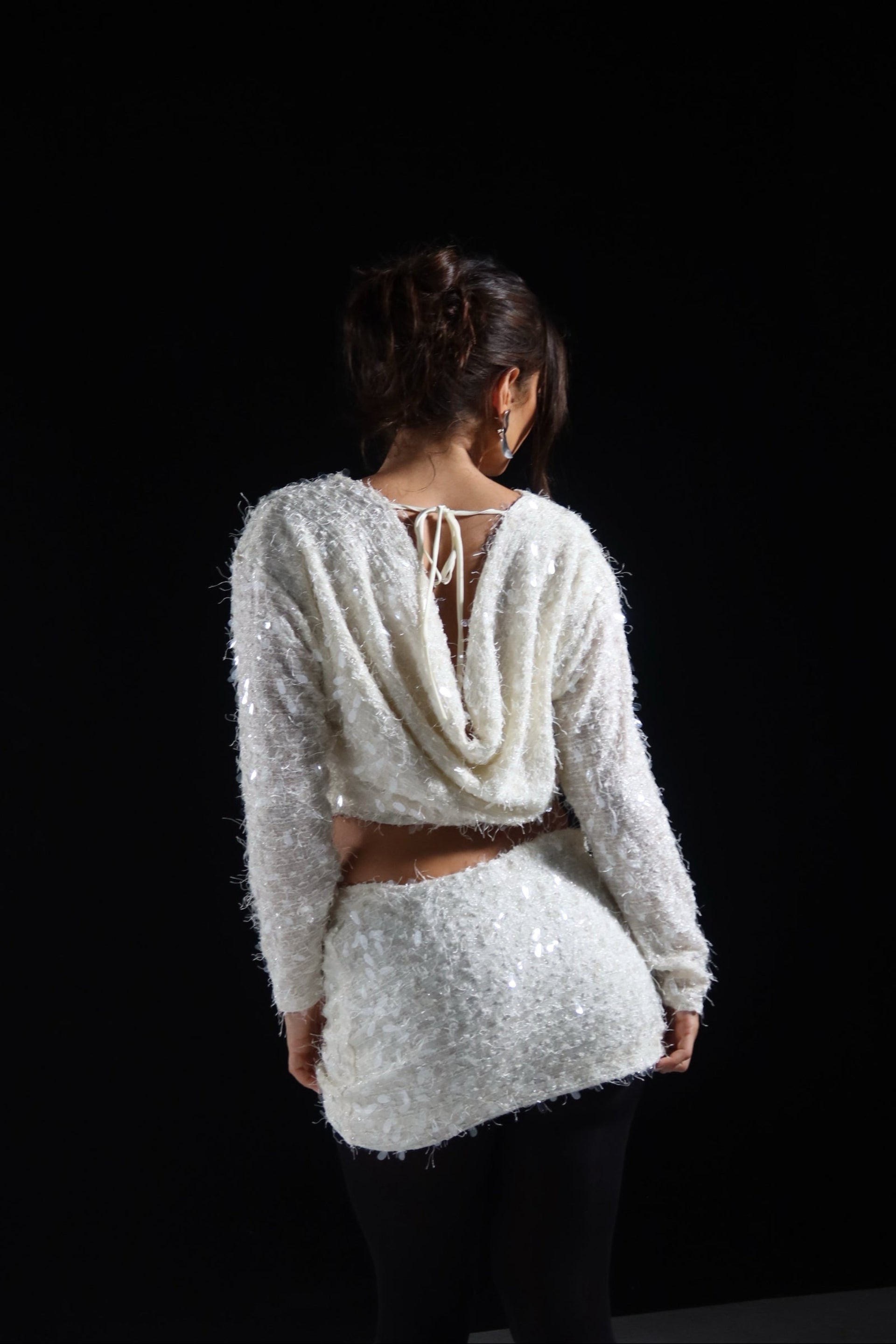 Elevate your evening look with this striking sequin mini skirt set, designed for those who command attention. The pristine white sequins create a luminous, eye-catching finish that catches light beautifully, while the sophisticated cowl back detail adds an unexpected elegance and dimension. Perfect for cocktail events, celebrations, or nights out where you want to make a memorable impression. The coordinated set ensures effortless styling, allowing you to focus on confidence rather than coordination. A versatile piece that transitions seamlessly from venue to venue.