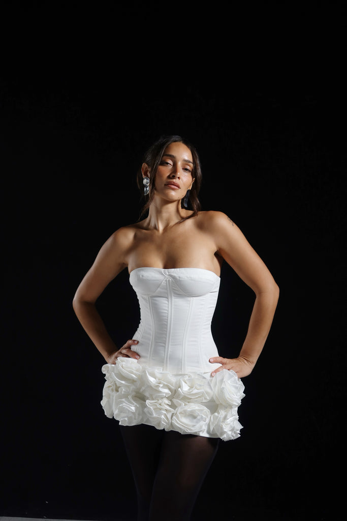 Elevate your ensemble with this sophisticated white corset set, featuring a structured strapless corset with adjustable back closure for a customized fit. The coordinating mini skirt showcases delicate floral embellishments that add romantic dimension to the silhouette. This versatile two-piece design transitions seamlessly from evening wear to statement styling, offering both visual impact and wearable comfort through thoughtful construction and refined detailing.