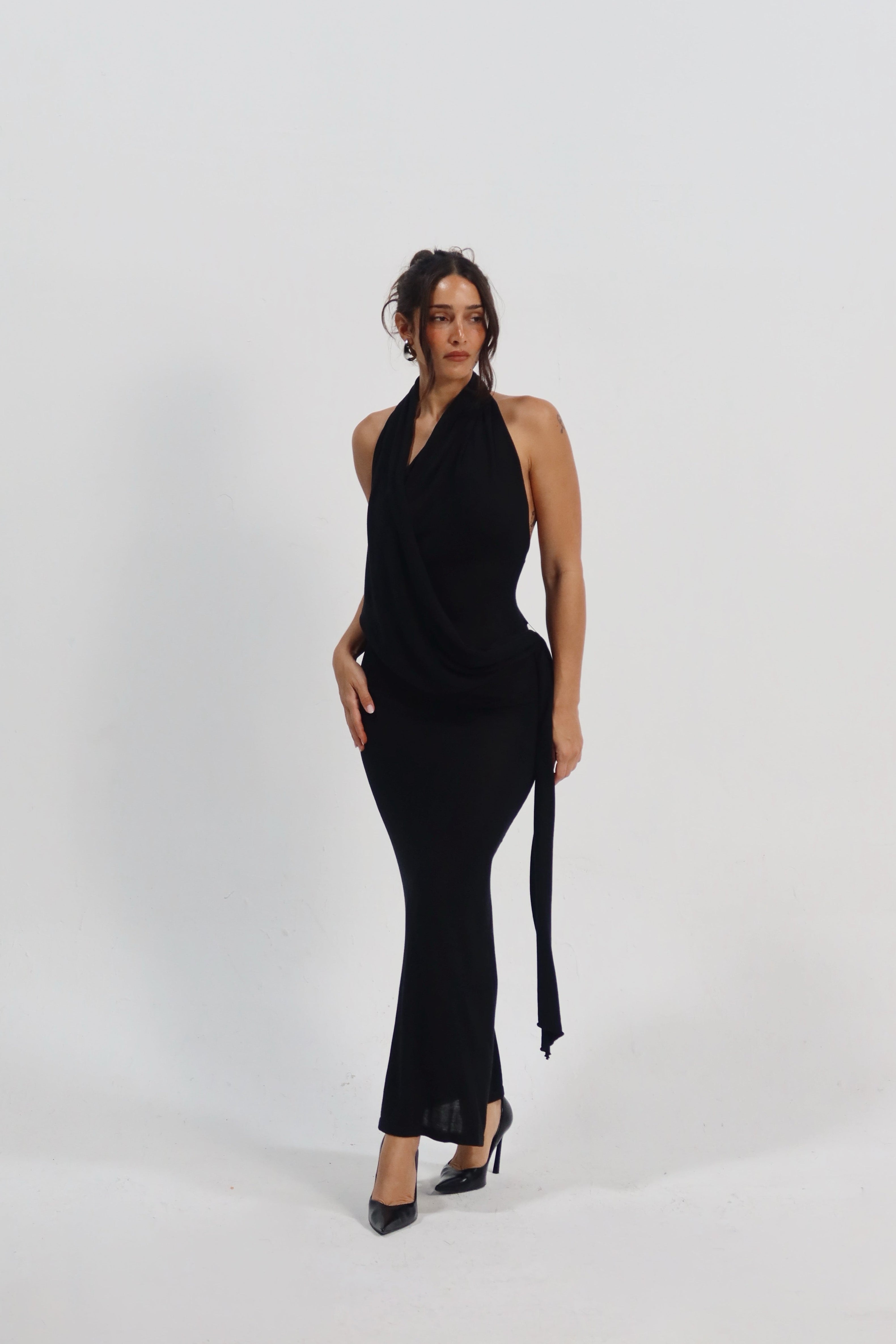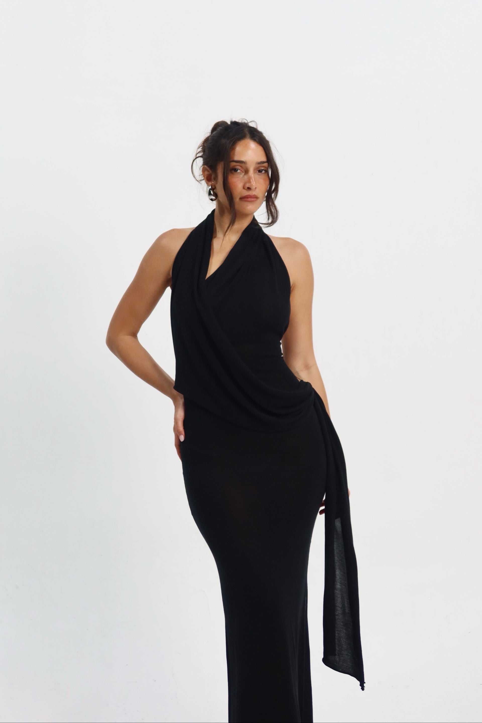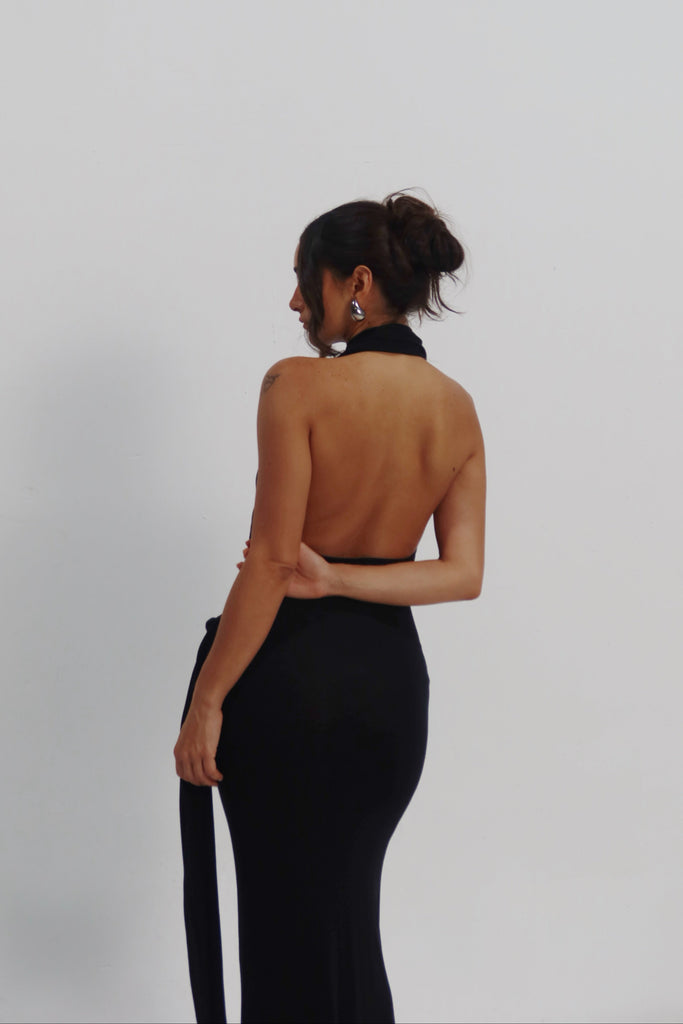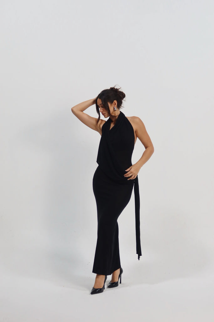 Elevate your evening wardrobe with this striking asymmetrical maxi dress in classic black. The dramatic open back design creates an unexpected focal point, offering modern sophistication with a daring edge. The asymmetrical silhouette flatters the figure while the flowing maxi length provides elegant movement. Perfect for upscale events, cocktail parties, or anyone seeking a statement piece that balances timeless style with contemporary flair.